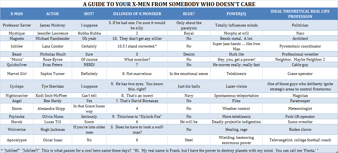 You looked at a history of what? Seven? Eight? previous X-Men films and you came to the conclusion: “what we need here is more blue. We don’t have enough blue guys. I want to make it look like the Smurfs have grown up and started kicking ass…” Ummmm, ok, sure. But if you’ll allow a slight contradiction – you were doing better when you decided the key to these movies was getting the maximum sexy time out of Jennifer Lawrence and Hugh Jackman.