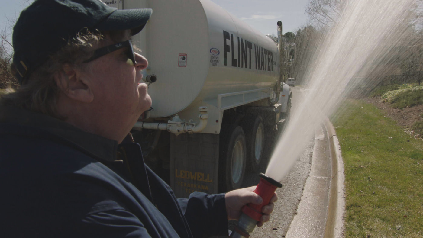 For what he is, Moore continues to be an exceptional filmmaker. Here I am watching his work and questioning the motives of President Barack Obama, a man who is not perfect by any stretch, but one I know to be committed to the just side of history. This is the magic of false equivalency delivered through hitman style editing – as you probably know, Flint, Michigan has a water crisis. The source of Flint’s water was Lake Huron. Thanks to some shady dealing, cronyism, and office profiteering, Governor Rick Snyder set up buddies to build a new Huron-to-Flint pipeline while ignoring the functioning old one. In the meantime, Flint’s source of water would be the toxic Flint River; this source sickened and continues to sicken the entire Flint population. After setting all this up, Moore captured Obama’s Flint visit. President (at the time) Obama was told that the problem was fixed (a moment left out of the film) and makes a spectacle of drinking “clean” Flint water during a press conference while addressing local problems.