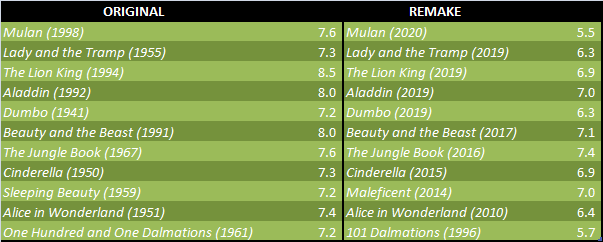 This “Live Action” experiment…is it not working? Let me rephrase that: This “Live Action” experiment … it is not working. I suppose I need to clarify: If the objective were to milk a cash cow until Bessie done run dry, Disney, congratulations, your plan is magnificent. Bay all means, let’s convert every single cartoon the studio has ever made into non-animated form. If, however, the objective is to create new art, convert more children, or enhance classic tales, this experiment is a failure. But hey, don’t take my word for it; check out imdb voters. Do keep in mind that as internet science is relatively new and so are the majority of its patrons, newer films tend to rate higher. Below is a chart of imdb ratings for Disney animated classics v. Disney “Live Action” remakes. Anybody notice a pattern?