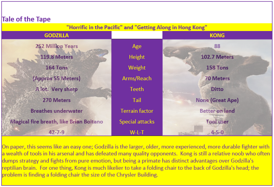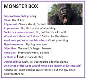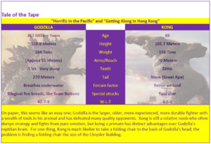 I’m beginning to suspect Godzilla films are not based in genuine science. I mean, they seemed slightly far-fetched before, what with there being a semi-intelligent skyscraper-sized atomic lizard defender of Earth, but now I suspect they’ve gone from “absurd exaggeration” to “just making shit up.” I suppose I could be wrong. I mean it’s possible that this Godzilla is such an insecure apex predator that it feels threatened by even the slightest amount of competition and will literally travel multiple oceans just to destroy either a man-made homage or a primitive battleship-sized gorilla.