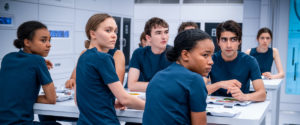 Fast-forward to the awkward teen years and two of the pack of docile, robotic, rule-following kids suddenly realize their food has been spiked with downers. (Gotta hand it to a mission statement that prepared eighty-six years worth of tranquilizers) The two, Christopher (Sheridan) and Zachary (Fionn Whitehead) rebel and turn almost instantly into genuine teens. Five minutes later, Zach has gone full Trump: committing