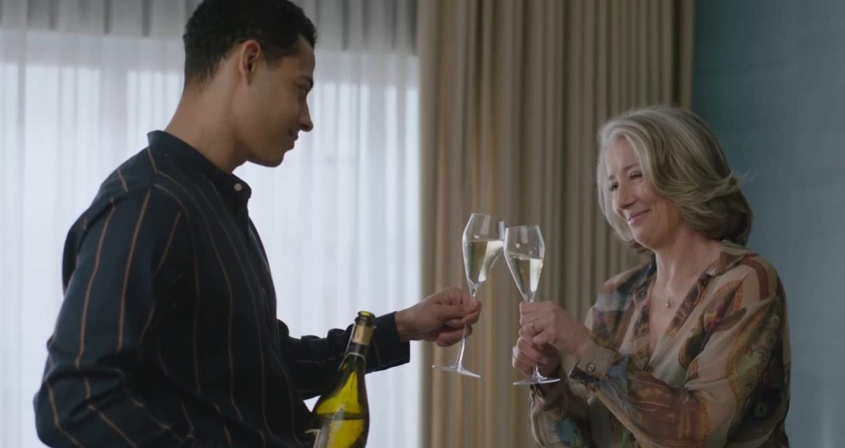This film is a compilation of no fewer than four meetings between professional escort Leo Grande (Daryl McCormack) and Nancy in the upscale London hotel room she’s rented. Leo is presented as –I imagine- everything one looks for in an escort. He’s handsome, young, cut, attractive, amiable, communicative … he’s also patient, kind, attentive, reassuring, and decent. It’s good to know the “hooker with a heart of gold” cliché doesn’t limit itself to women.