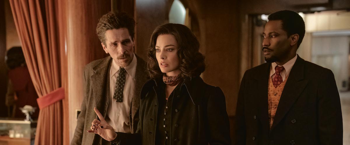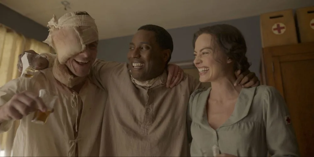 For all the talent, there are only three decent parts in Amsterdam and they belong to Bale, Robbie, and Washington, who play friends scarred by WWI and thriving as a trio in spite of it. Their salad days are reported via flashback as then two-eyed Dr. Burt Berendsen (Bale) gets sent to France in 1918 to help pull together an all black platoon. The loyalty he shows the platoon is rebounded in misery when he returns to New York after the war and finds his practice and his life hindered by the stigma of the company he keeps. Hence, he reflects upon a brief post-war hiatus when he, Harold Woodsman (Washington), and the nurse who mended both men, Valerie Voze (Robbie) all lived together in Amsterdam.