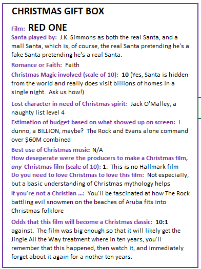 Here’s the latest attempt at Christmas timelessness, and this one stars The Rock as Santa’s best bud/bodyguard. Why does buff, athletic, heavy-lifting Santa need a bodyguard? Because the minute The Rock’s back is turned, Santa goes and gets himself kidnapped. And now Christmas is in JEOPARDY! [Just as it has been every year since Miracle on 34th Street.]