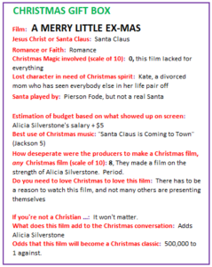 period. If it didn’t happen at Christmas, we wouldn’t care about any of the characters in any way. And because it happened at Christmas. I find the whole thing false and fabricated. Want to see two exes that don’t fight get back together and not fight? Here ya go. What this film lacks in plot is easily compensated by what it lacks in controversy.
