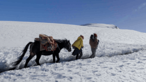 While the film didn’t find snow leopards, it found two women, snow leopard conservationalist Tshiring Lhamu Lama, and the teenager she’s trying to bribe into submission, Tenzin Bhuti Gurung. The latter just lost her sister to illness, her father to jail and her livelihood to the snow leopards who slaughtered every one of their 40 goats last night. Ms. Lama has come by to quell the anger. It looks like the coming-of-age Tenzin will likely to be sold off for marriage to keep she and the remainder of her kinfolk alive. But, hey, before that happens, why not attend snow leopard camp! Tenzin, you seem like a reasonable sap, er, girl! Come with me on a 15-day journey, and I’ll show you how to track snow leopards.
